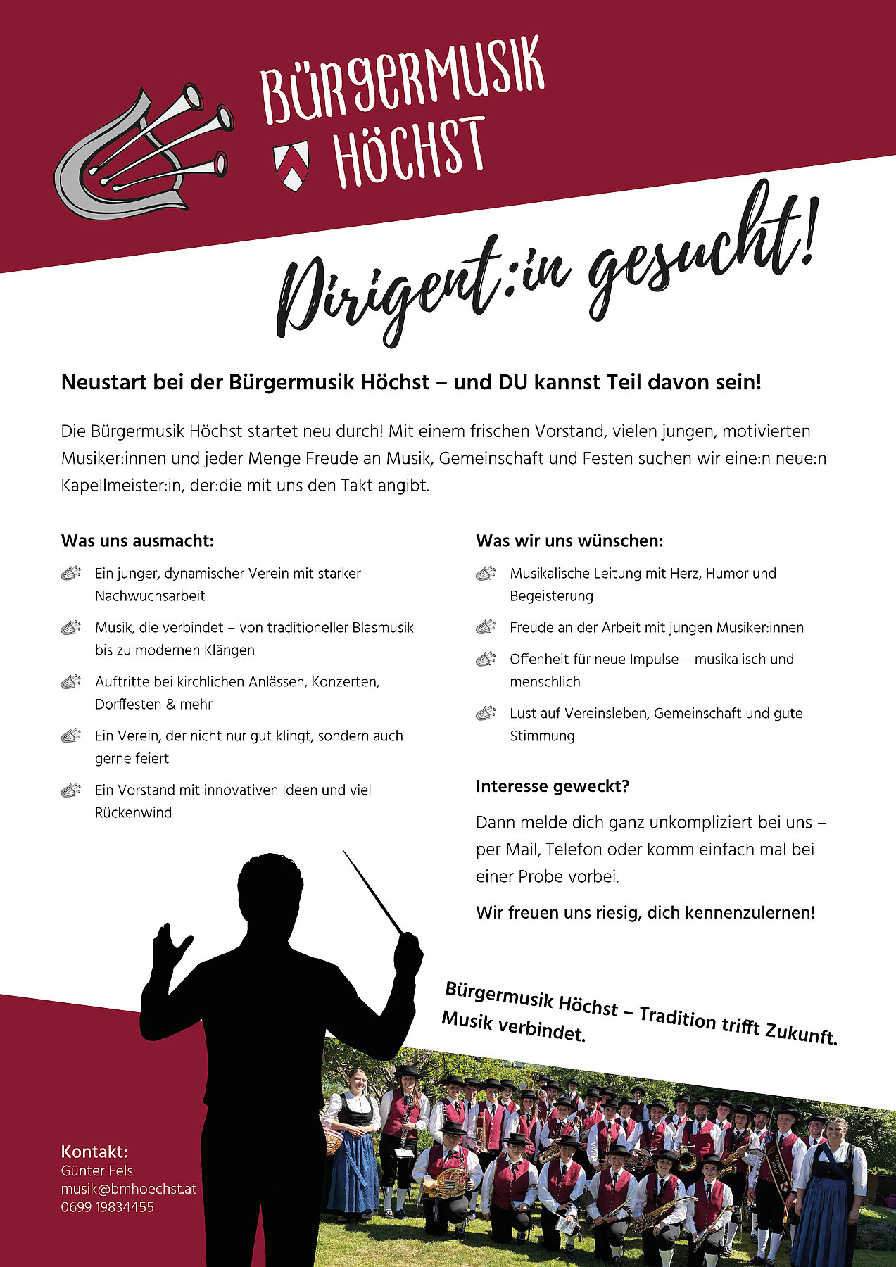 Die Bürgermusik Höchst startet neu durch! Mit einem frischen Vorstand, vielen jungen, motivierten Musiker:innen und jeder Menge Freude an Musik, Gemeinschaft und Festen suchen wir eine:n neue:n Kapellmeister:in, der:die mit uns den Takt angibt.